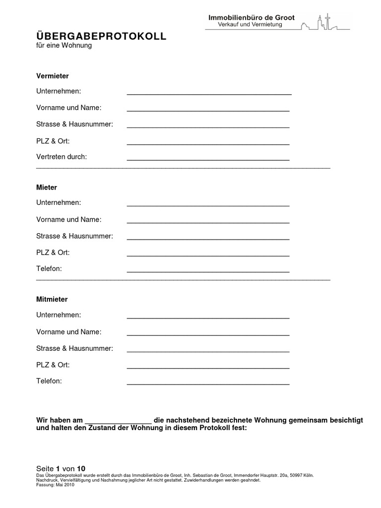 Ubergabeprotokoll Fur Eine Wohnung Pdf